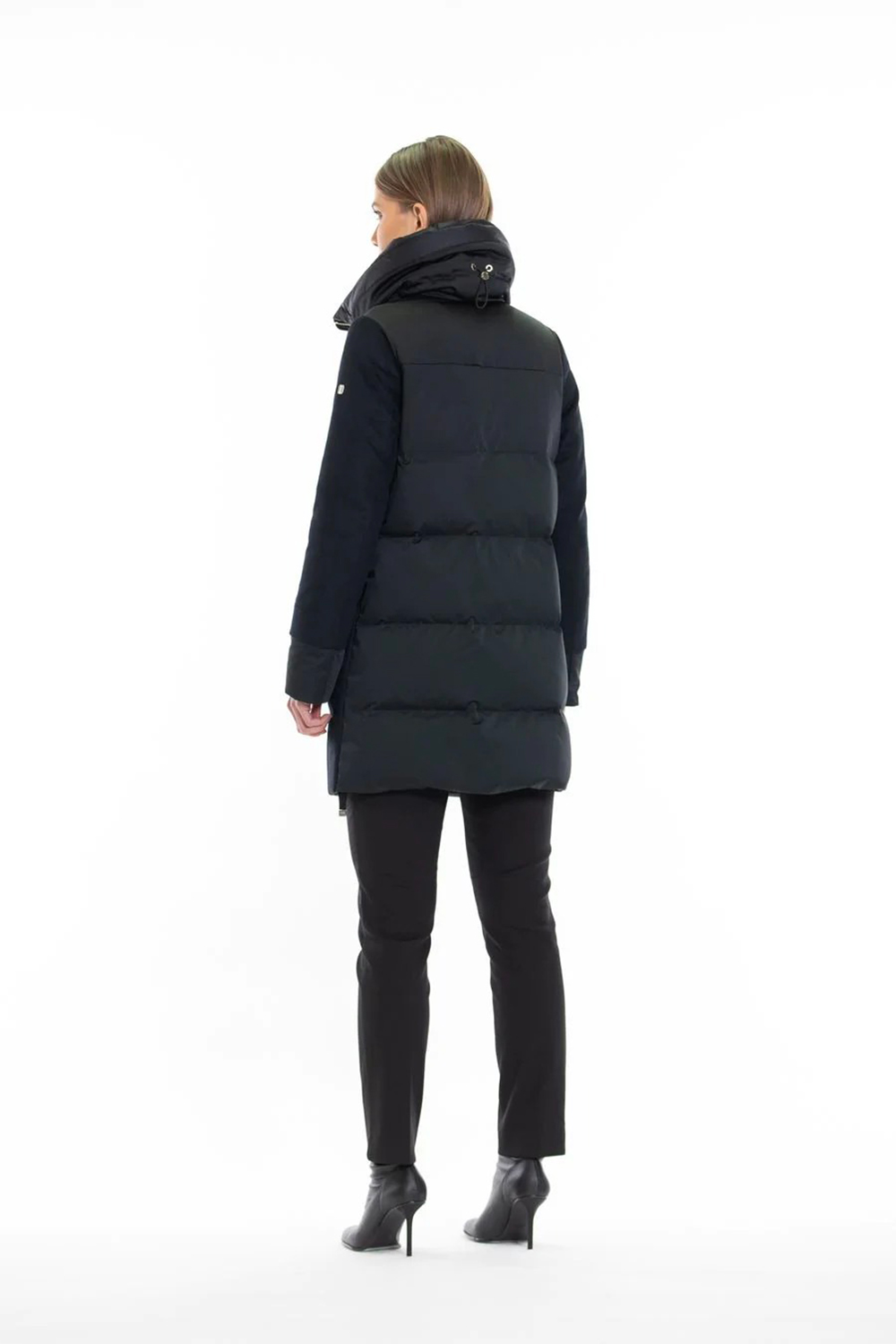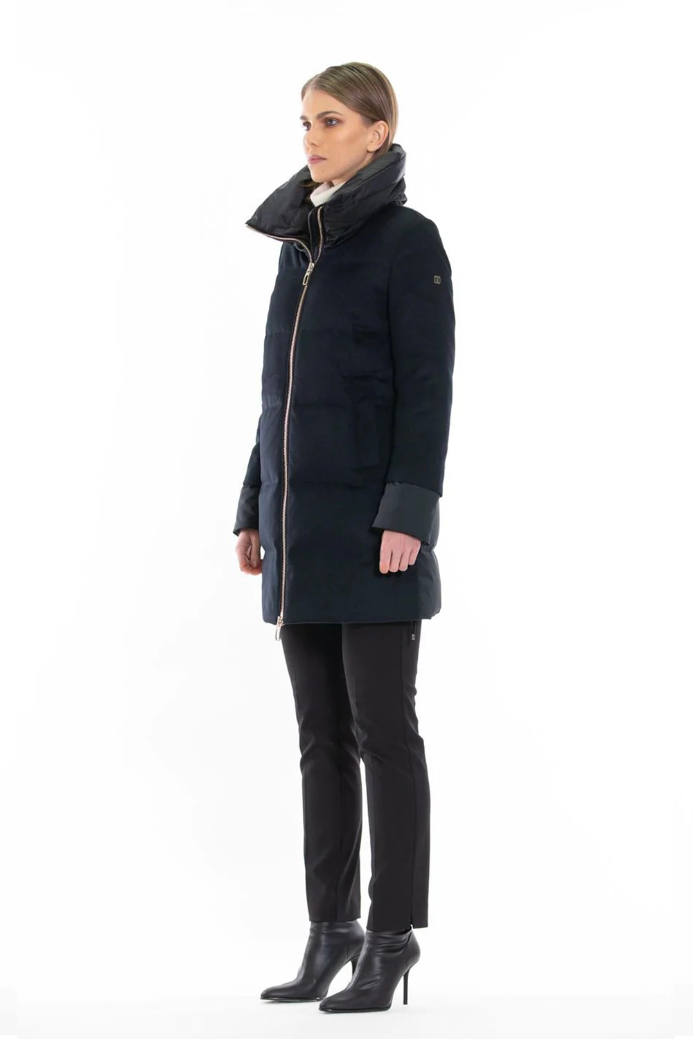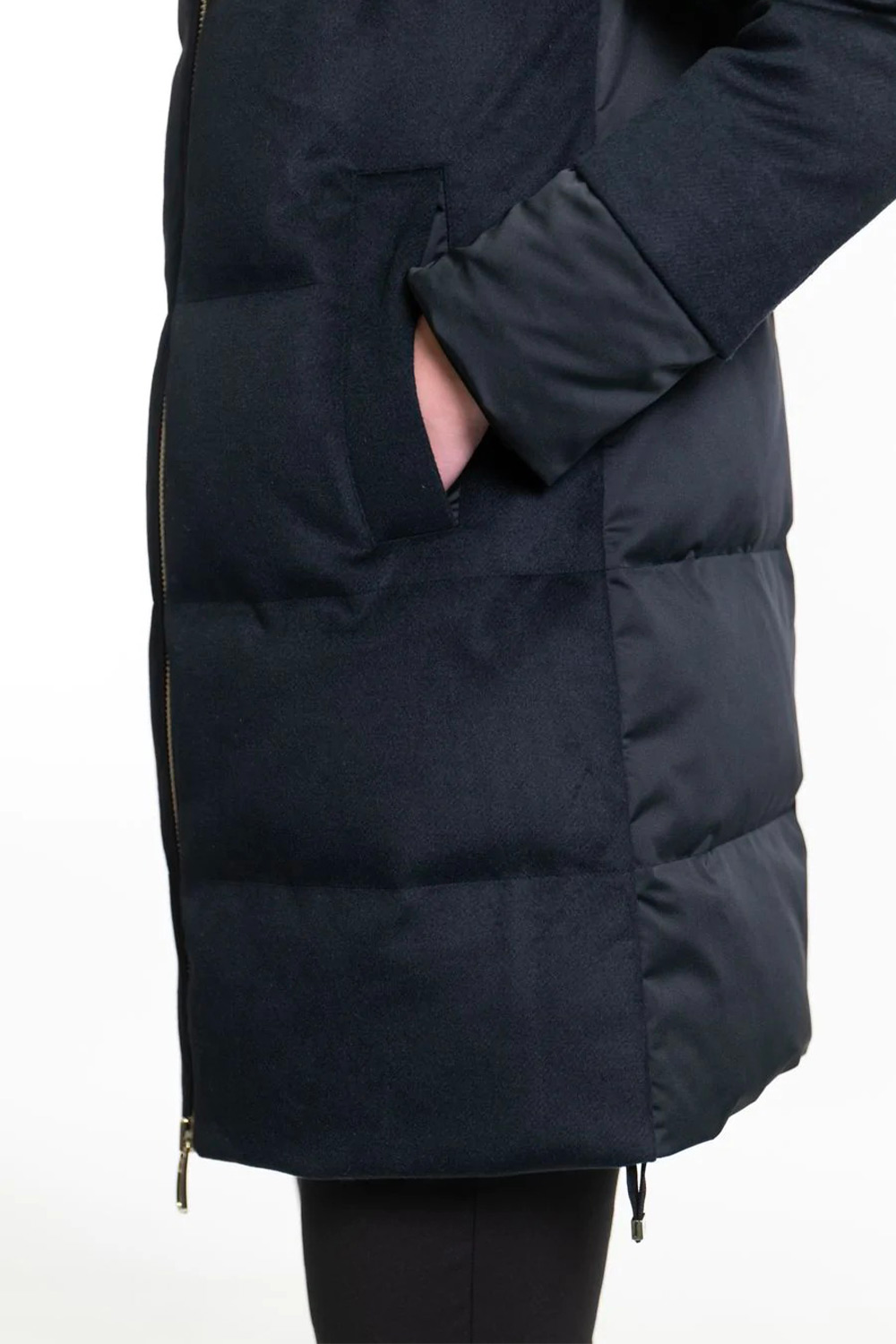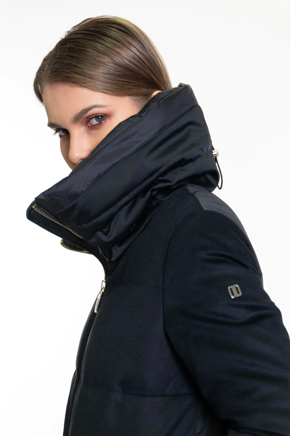 Piumino bimateriale: lana tecnica sia sul carré dietro che sul davanti e tessuto tecnico trapuntato con trama satinata sul retro e sia sul fondo maniche che sui dettagli tasche. Il capo è caratterizzato da un ampio collo in piedi regolabile con coulisse, tasche a filetto, chiusura frontale con cerniera metallica a doppio cursore con rifiniture oro chiaro e coulisse al fondo per regolare la vestibilità del capo.Bimateriale: lana tecnica sia sul carré e tessuto tecnico trapuntato