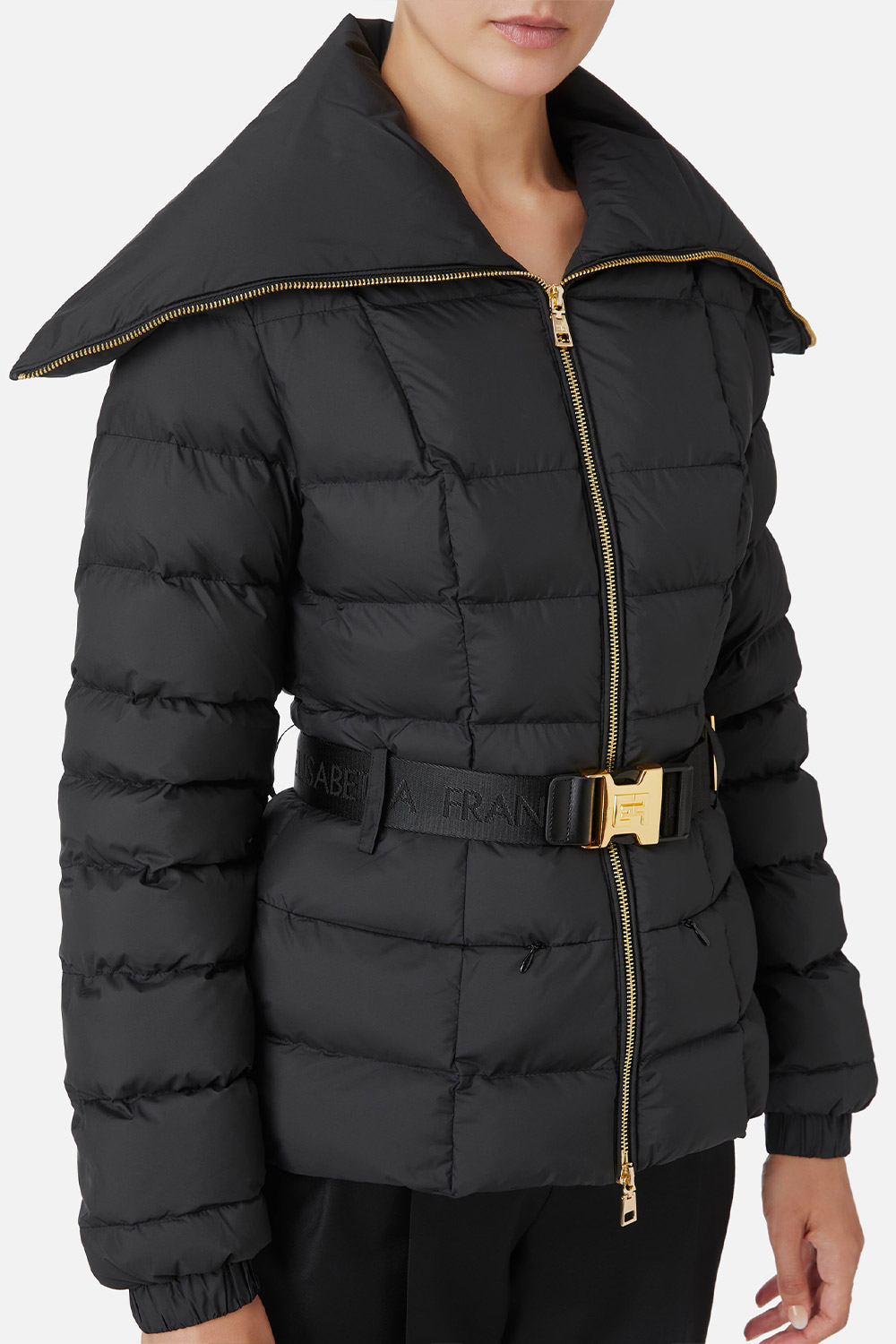 • Punto vita con cintura in elastico logato e fibbia in metallo dorato