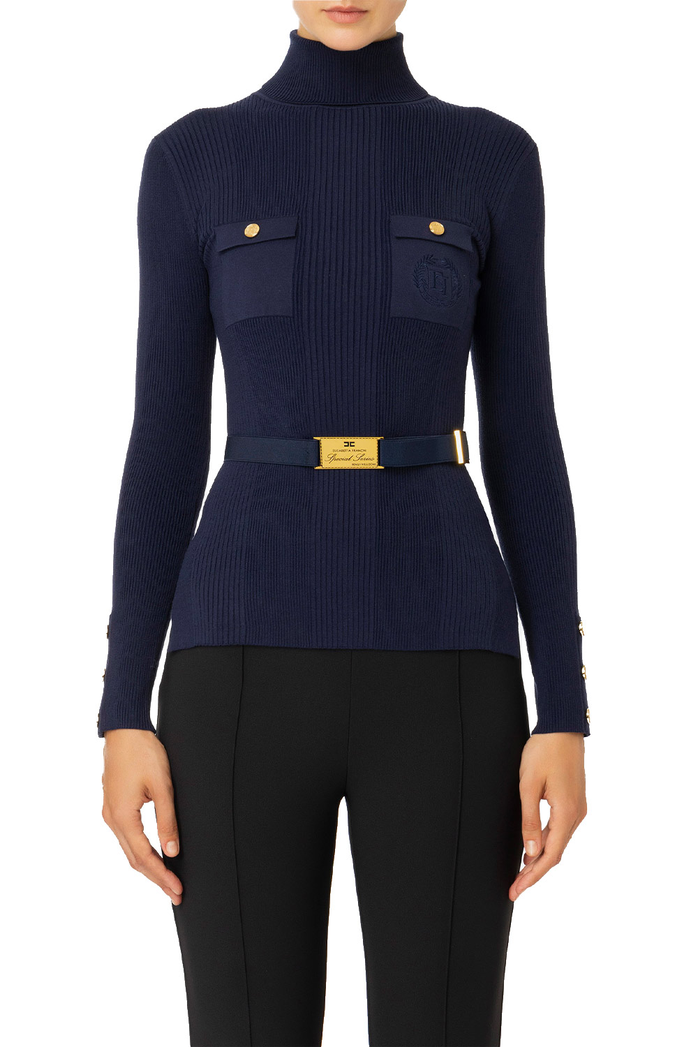 • Punto vita con cintura removibile in elastico logato e fibbia in metallo dorato
