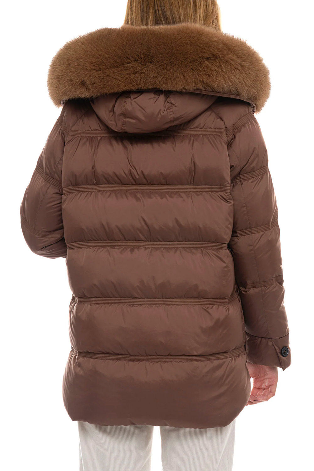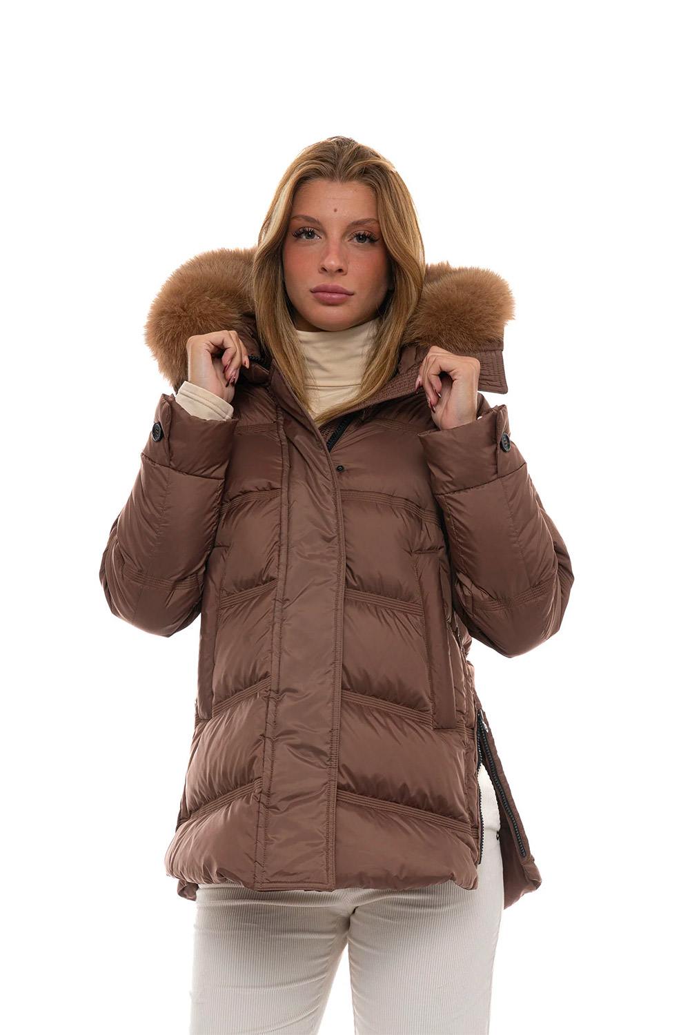• Cappuccio fisso bordato in pelliccia in tono colore